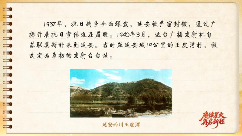 1937 年,抗日战争全面爆发,延安被严密封锁,通过广播开展抗日宣传迫在眉睫。1940 年 3 月,这台广播发射机自苏联莫斯科来到延安。当时距延安城 19 公里的王皮湾村,被选定为最初的发射台台址。