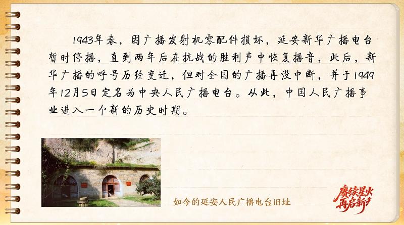 1943 年春,因广播发射机零配件损坏,延安新华广播电台暂时停播,直到两年后在抗战的胜利声中恢复播音,此后,新华广播的呼号历经变迁,但对全国的广播再没中断,并于 1949 年 12 月 5 日定名为中央人民广播电台。从此,中国人民广播事业进入一个新的历史时期。