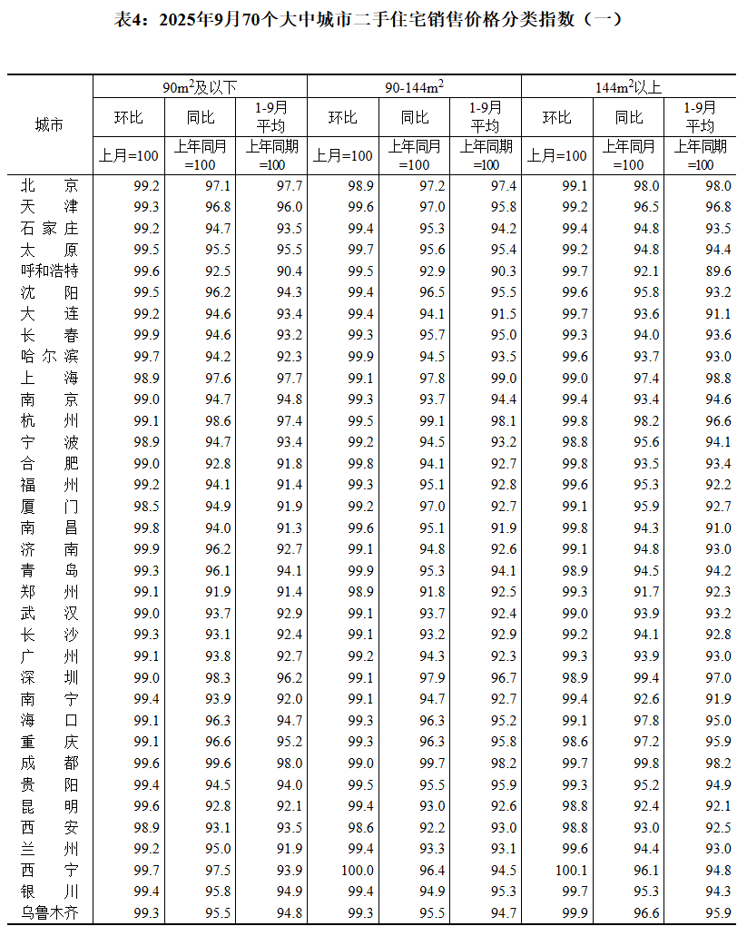 国家统计局数据显示,9月份,一线城市二手住宅销售价格环比下降1.0%,降幅与上月相同。其中,北京、上海、广州和深圳分别下降0.9%、1.0%、0.8%和1.0%。二、三线城市二手住宅销售价格环比分别下降0.7%和0.6%,降幅均扩大0.1个百分点。