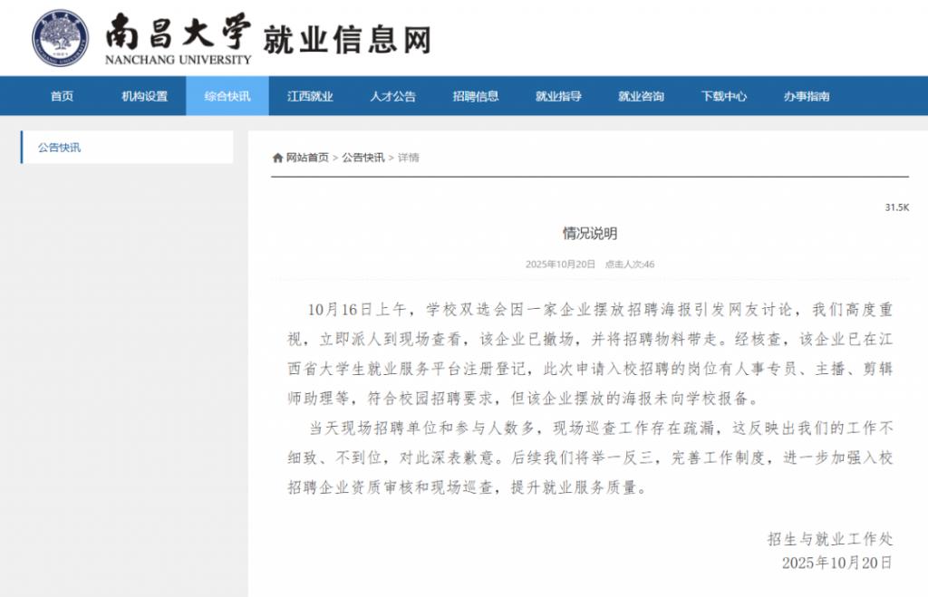 10 月 16 日上午,学校双选会因一家企业摆放招聘海报引发网友讨论,我们高度重视,立即派人到现场查看,该企业已撤场,并将招聘物料带走。经核查,该企业已在江西省大学生就业服务平台注册登记,此次申请入校招聘的岗位有人事专员、主播、剪辑师助理等,符合校园招聘要求,但该企业摆放的海报未向学校报备。