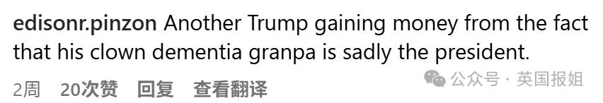 " 又一个川普家族成员仅仅是因为家里那患有痴呆症的滑稽老头儿当上了总统,就能大发其财的例子 ..."