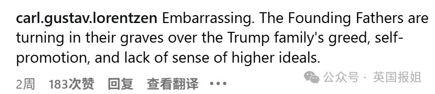 " 尬死了。美国的开国元勋们在九泉之下想必也会因特朗普家族的贪婪、自我推销以及缺乏更高理想的思想状态而压不住棺材板。"