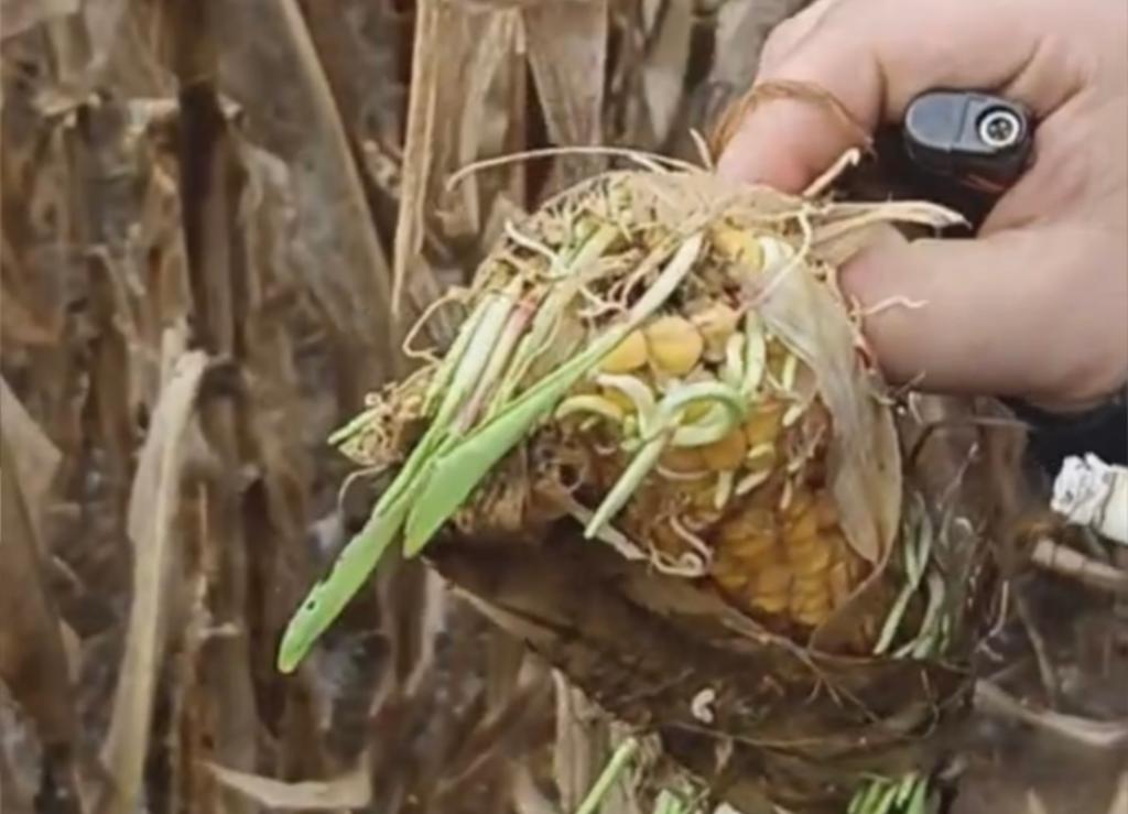 而长在积水田地的玉米等不了太久。在跟南风窗记者视频通话过程中,王力掰开一些玉米的外衣,视频显示,里面的籽粒有些泛黑,有些已经生芽。