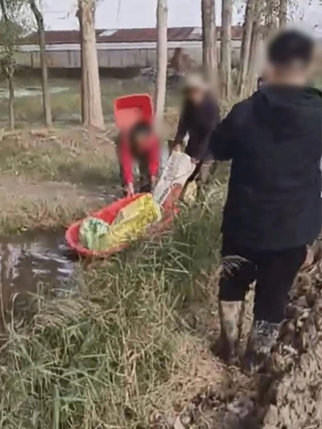 沟渠尽头,村民们将装着玉米的澡盆拉上岸 / 受访者供图