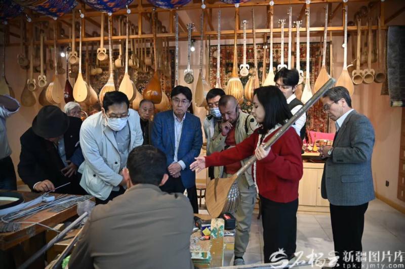 10 月 17 日,日本知名学者和经济界人士代表团参观中国新疆民族乐器村。任鹏程摄