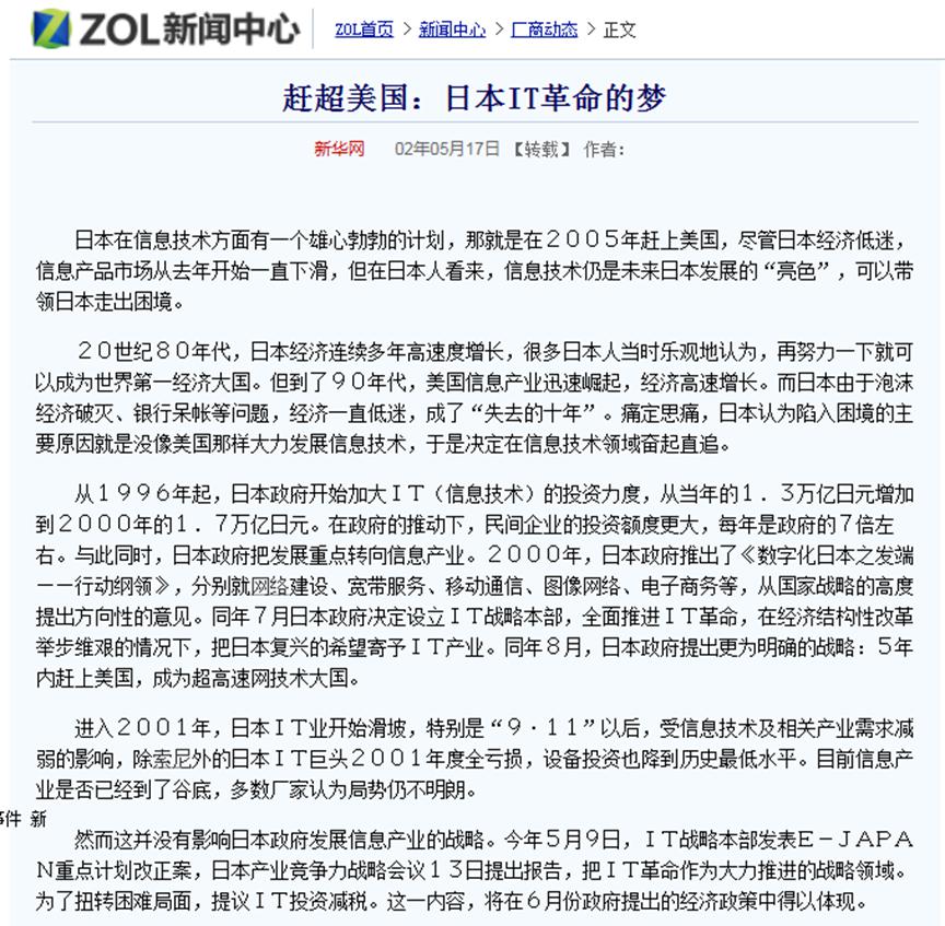 2001 年,日本政府颁布《IT 基本法》,推出 "e-Japan 战略 ",目标是在 5 年内建成世界最先进的 IT 国家。该战略成效显著,同年日本企业互联网普及率就高达 95.8%,电子商务市场规模达到 47.8 万亿日元,其 IT 应用水平位居世界前列。