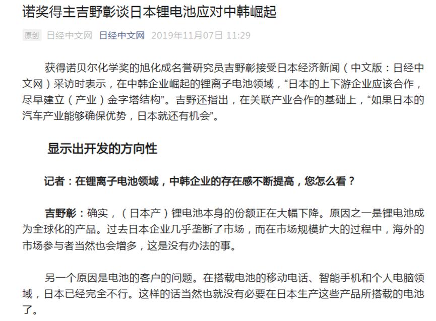 吉野彰认为 " 日本电池正立于悬崖之上。"