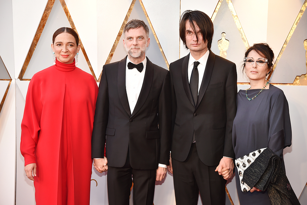 2018年,保罗·托马斯·安德森(左二)与伴侣玛娅·鲁道夫(左一)、强尼·格林伍德(右二)与他的妻子Sharona Katan一同出席奥斯卡颁奖典礼。