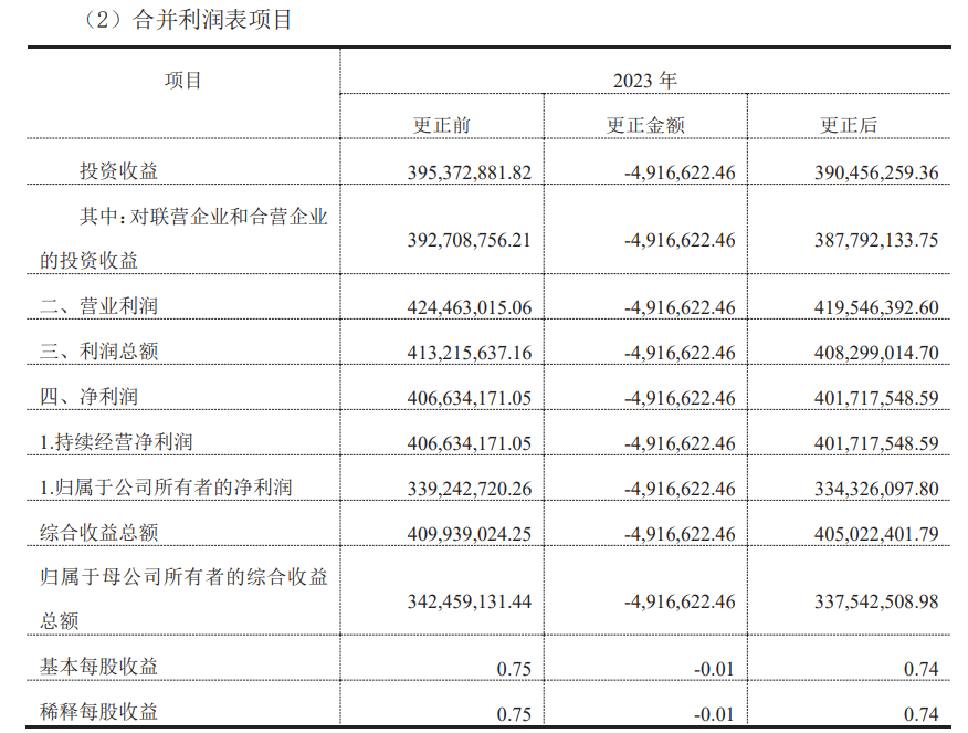 联创光电根据联创超导前期会计差错更正对2023年度净利润的影响额,根据持股比例调减2023年12月31日长期股权投资491.66万元,调减2023年12月31日未分配利润491.66万元,调减2023年度投资收益491.66万元。