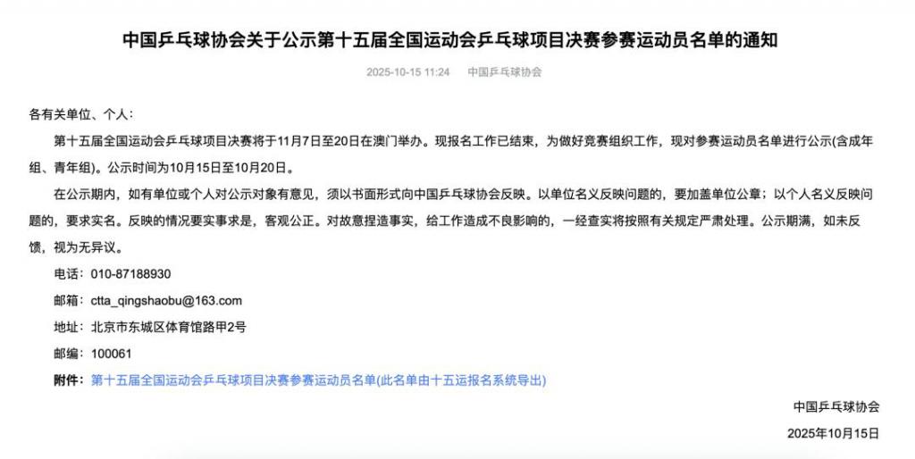 10 月 15 日,中国乒乓球协会公布第十五届全国运动会乒乓球项目决赛参赛运动员名单:陈梦在列。乒乓球项目决赛将于 11 月 7 日至 20 日在澳门举办。
