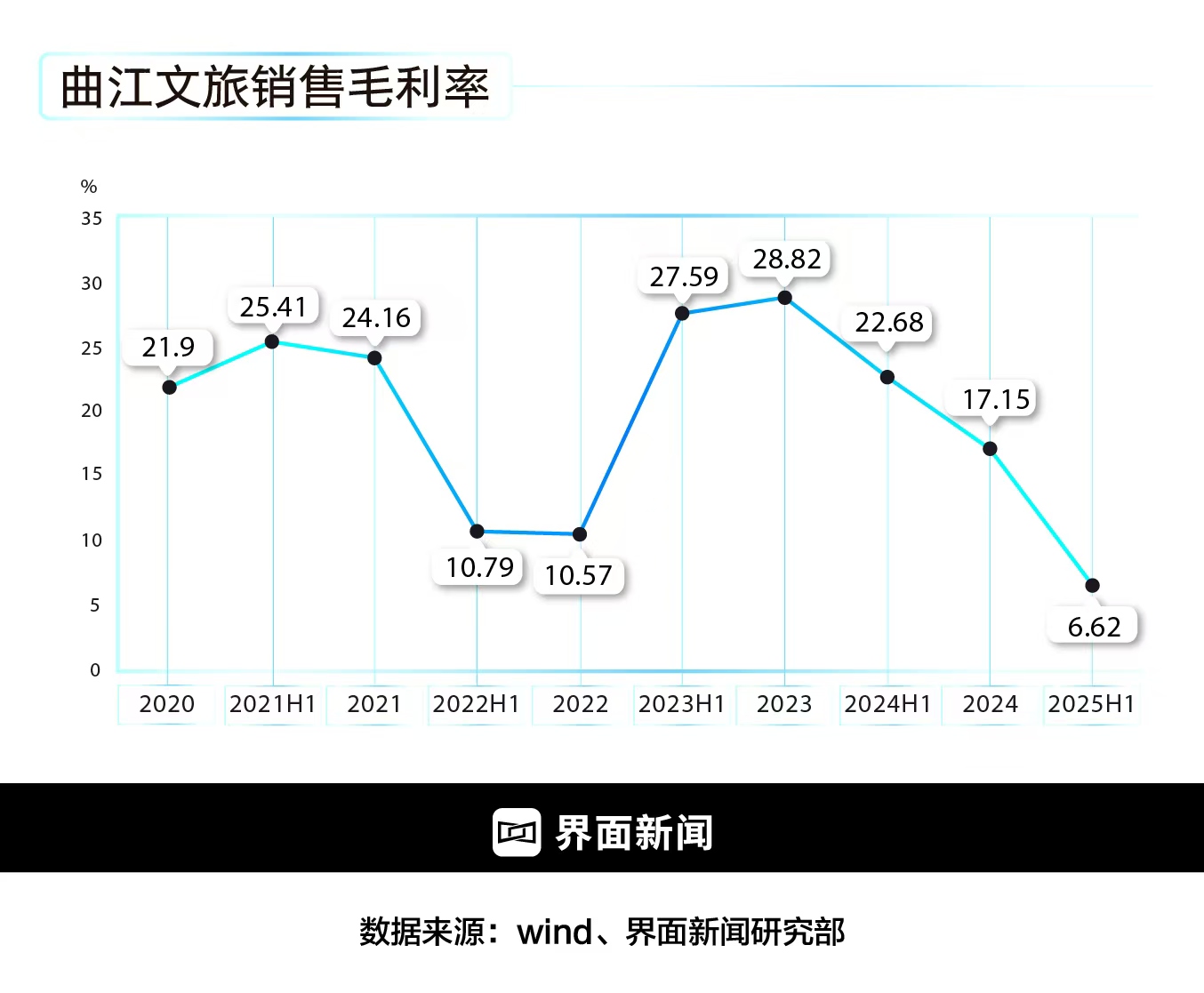 毛利率断崖式下跌更直观反映出主业造血能力衰退。上半年,曲江文旅整体毛利率仅为6.62%,同比降16.06个百分点,景区运营管理、酒店餐饮等核心板块均出现成本率高企的问题。“毛利率跌破10%意味着核心业务已接近盈亏平衡线,一方面是折旧摊销等固定成本居高不下,另一方面门票定价和二次消费开发能力薄弱,无法通过收入端覆盖成本压力。”上述分析师对界面新闻记者表示。
