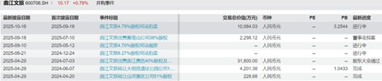 从2024年起,曲江旅投的持股已多次被推上司法拍卖台,但彼时多以“和解撤诉”收场,未发生实质性股权变更;进入2025年,拍卖节奏明显加快,且多以“股权让渡”告终,控制权稀释趋势已成定局:
