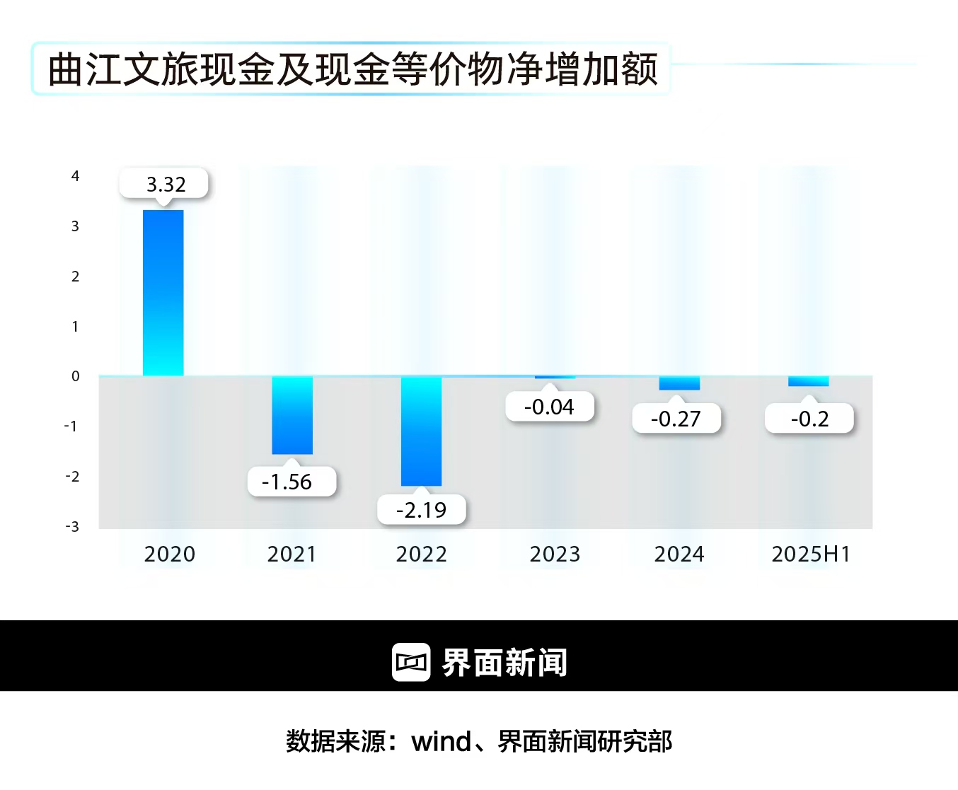 截至6月末,曲江文旅短期借款达2.14亿元,一年内到期的非流动负债1.49 亿元,而账面货币资金仅1.03亿元,短期偿债缺口超过2.6亿元。长期借款的 5.89亿元则进一步加剧了利息负担,公司上半年财务费用达1908.6万元。更严峻的是,公司现金及等价物持续净流出,自2021年起累计流出规模已对经营周转构成实质性制约。