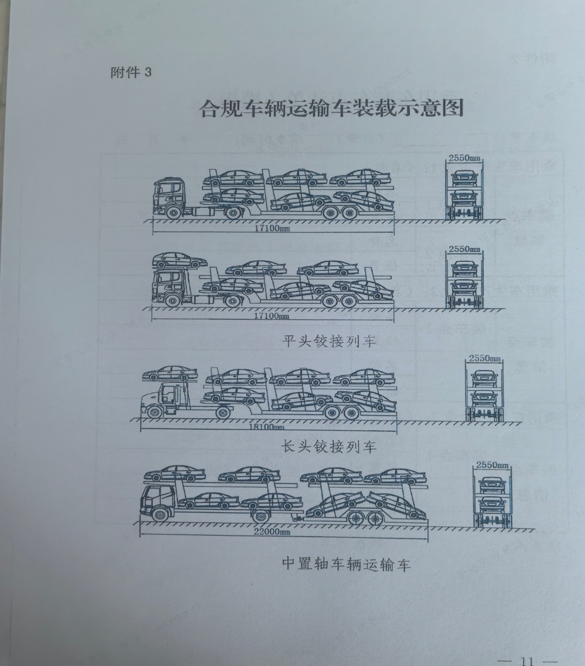《车辆运输车专项治理行动方案》明确规定:“对平头铰接列车装载超过6辆、长头铰接列车装载超过7辆、中置轴车辆运输车装载超过9辆的,均认定为违法运输车辆,禁止驶入高速公路。”