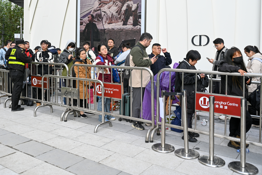 10月24日深夜,上海,顾客在恒隆广场外面排队等候。澎湃新闻记者 朱伟辉 图
