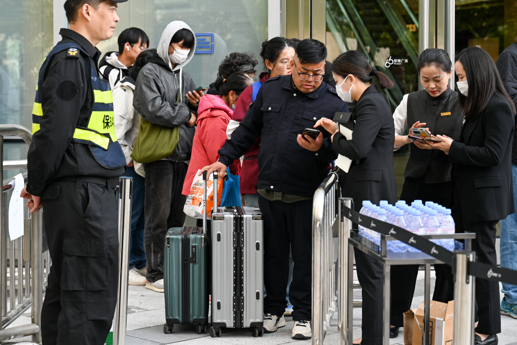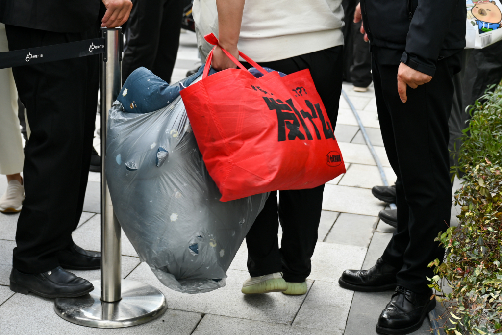 顾客手里拎着昨晚休息用的被子。澎湃新闻记者 朱伟辉 图