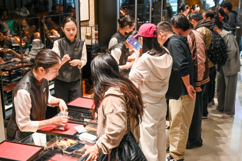 10月25日,老铺黄金上海恒隆广场店,顾客在挑选金饰品。澎湃新闻记者 朱伟辉 图