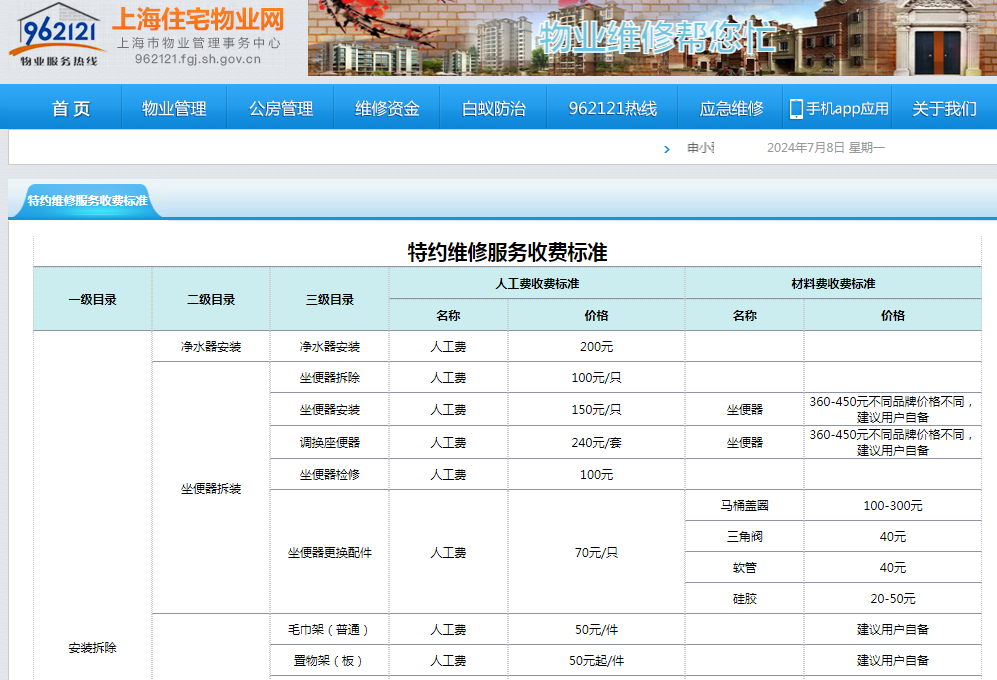 据介绍,962121热线特约维修服务上线后,各家特约维修服务单位做到各项服务“统一标准,统一收费”。市物业中心在上海住宅物业网公示了最新的特约维修服务七大类67项服务内容的服务价格,包括特约维修服务中的上门费、维修费和材料费等收费标准,进一步推动维修服务收费公开、透明。