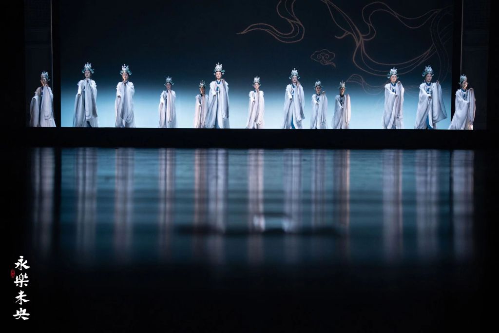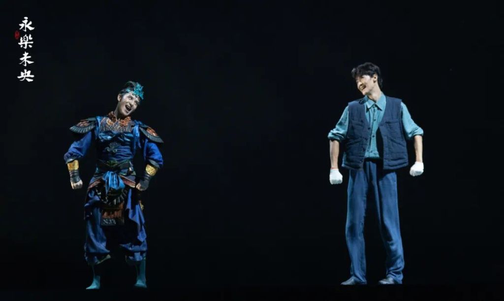 舞台上两个时空同频:元代建造者与当代建筑师心神交汇;元代女画工与当代美术师隔空共鸣;琉璃匠师与七百余岁的老角神相伴,复原失传已久的孔雀蓝釉琉璃制法;迁建者们挥洒十年青春,和三门峡争先、和黄河水赛跑,让永乐宫重获新生。
