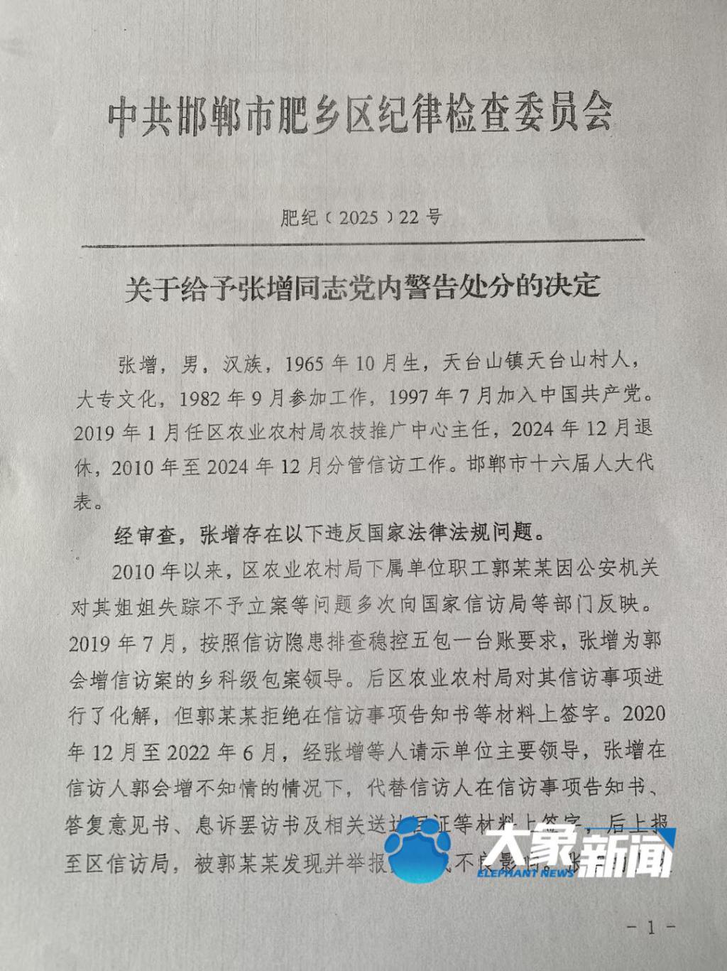 " 这次受到党内警告处分的张增,是肥乡区农业农村局的副局长,也是我信访案件的乡科级包案领导;受到记过处分的宋少虎,是区农业农村局信访科科长。"