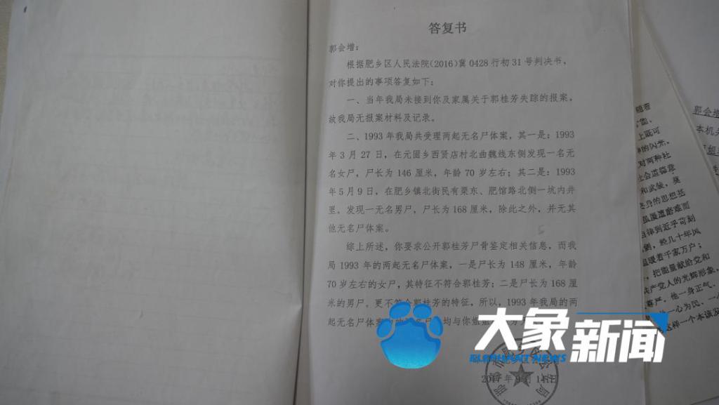 2016 年底,郭会增起诉肥乡区公安局行政不作为,要求公开枯井尸骨案鉴定信息。2017 年 8 月,法院判令警方作出答复。同年 9 月,当地警方出具答复书,称枯井内 " 发现一无名男尸,尸长 168 厘米。"