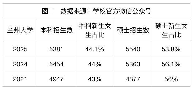 如下图所示(见图 2),兰州大学近几年的本科、硕士招生数量十分接近,但硕士研究生新生女生占比持续高于本科阶段。