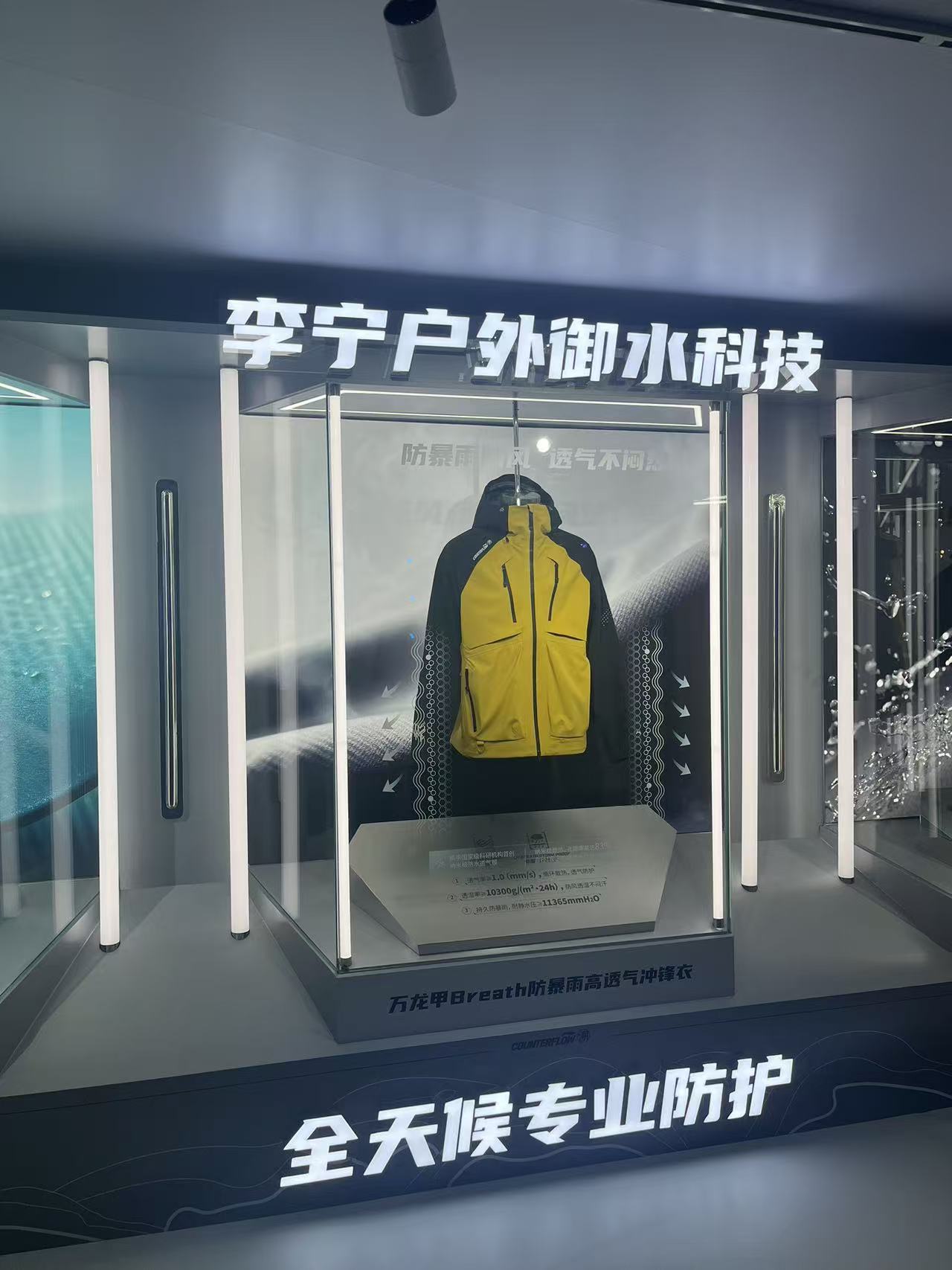 界面新闻在中国户外产业大会李宁展台观察到,现场设备模拟当水流倾泻而下时,面料抵挡住49mm-99mm级降水的渗透,以期给观展者更直接的观感。