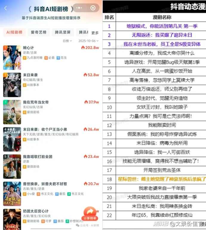 在新榜发布的“抖音AI短剧榜”中,我们还看到了另一部题材近似的作品《奶团太后宫心计》,应该是希望复制《奶团太后三岁半》的成功。我们可以把这份榜单视为观察目前AI真人短剧的一个“横截面”,与AI漫剧的热门榜单既有相通之处,又有着鲜明的反差。