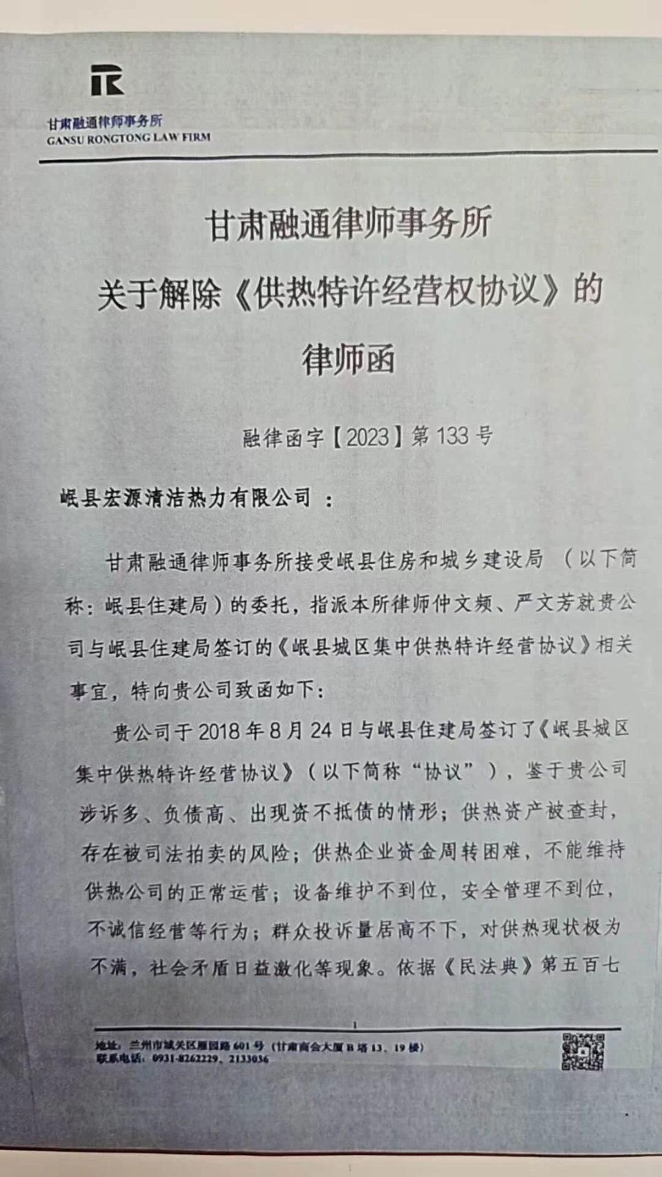 这份关于解除《供热特许经营协议》的律师函,是甘肃融通律师事务所受岷县住建局委托出具的。律师函称,鉴于宏源公司涉诉多、负债高、出现资不抵债的情形 ; 群众投诉量居高不下,对供热现状极为不满,社会矛盾日益激化等,依据民法典、住建部等相关法律规定,公司已违反相关法律法规规定并构成违约 …… 违法、违约行为已严重影响岷县供热保障,危及公共利益,且会导致《特许经营协议》的合同目的不能实现。
