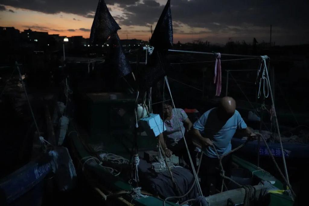 ● 9 月 23 日广东茂名电白区博贺港,一对绑紧渔船缆绳的夫妻。