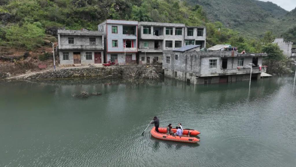 ● 10 月 27 日,百色市德保县,村民手划充气船出入。