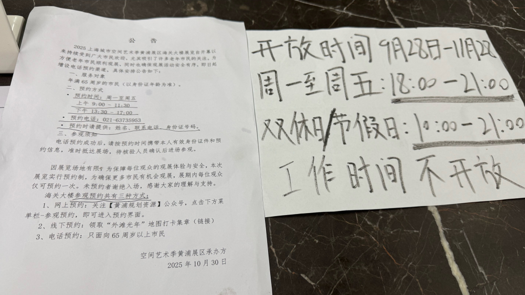 此前,黄浦区规划和自然资源局已作出观展提示:海关大楼目前仍作为办公场所使用,为不影响正常办公,特将展览开放时间安排在工作日晚间和双休日、法定节假日。此外,作为上海城市空间艺术季黄浦展区的临时展览,仅使用海关大楼一楼和三楼的部分区域,钟楼不作为展区对外开放。
