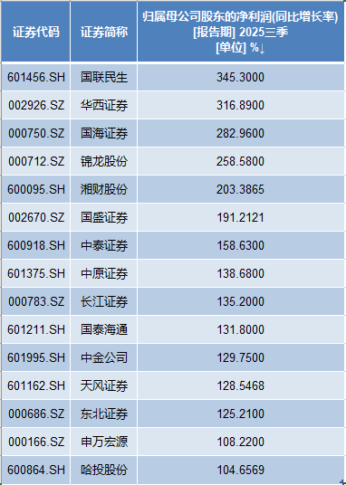 具体而言,国联民生、华西证券的净利润增幅分居前二,均超过300%,分别达到345.30%、316.89%。
