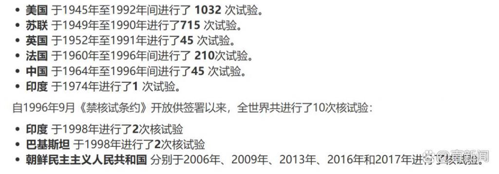 这里也说一下《条约》的背景。1945 年美国引爆了原子弹 " 瘦子 ",从此开启了核试验的历史。到 1996 年,全球共进行了 2000 多次核试验。其中美国进行了 1032 次,苏联于 1949 年至 1990 年进行了 715 次。