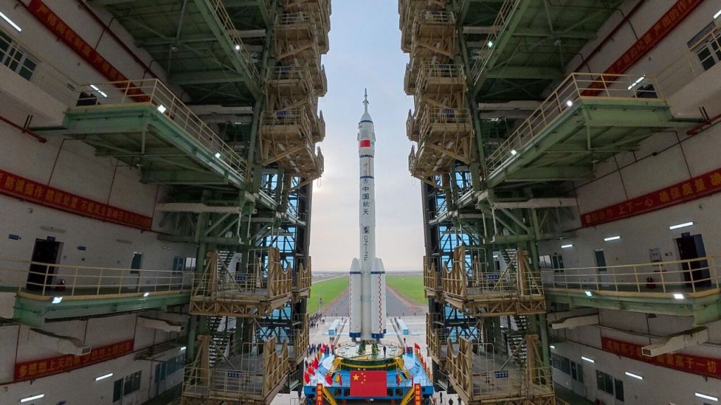 长二F火箭与神舟二十一号飞船组合体垂直转运