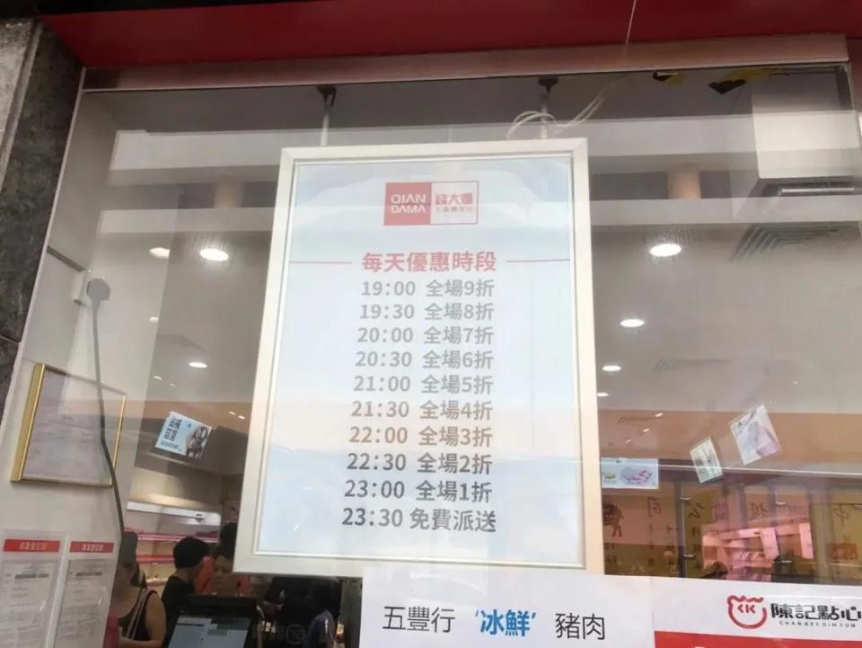 还有钱大妈,在内地就以 " 便宜 " 著称,2018 年进军香港市场,主打一个接地气:根据不同的时间段进行打折,而且越临近闭店时间,折扣力度就越大。