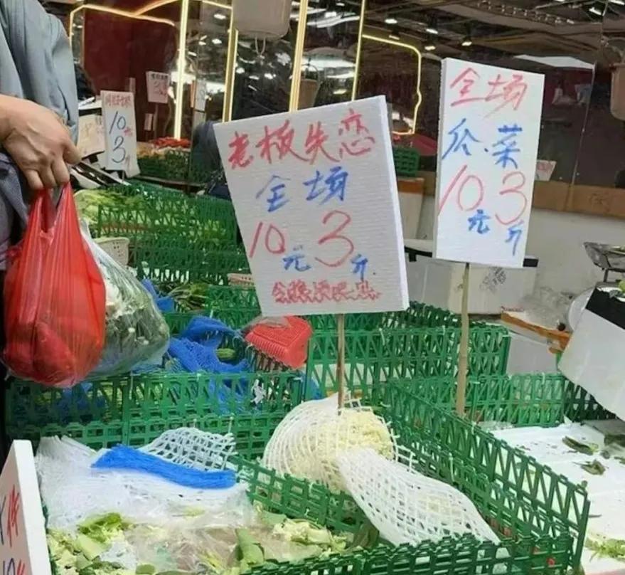 菜牌直接标明 " 同归于尽 "。有老板甚至还会根据心情调整价格,比如 "1 元一条 " 的瓜类和 "1 元一斤 " 的青菜。如果恰巧碰到 " 老板失恋 ",全场蔬菜统统 10 元 3 斤。
