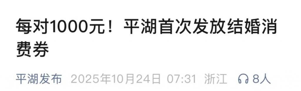 嘉兴平湖市表示,自 10 月 28 日起至今年底,面向在平湖市登记结婚的夫妻,以满减抵扣的形式,发放总额 1000 元的结婚消费券,用于婚庆相关消费。