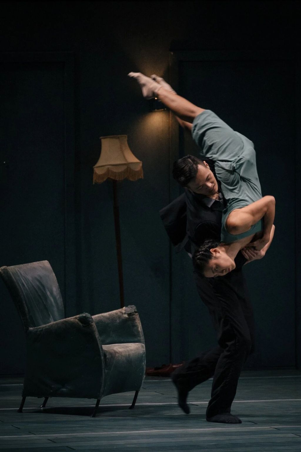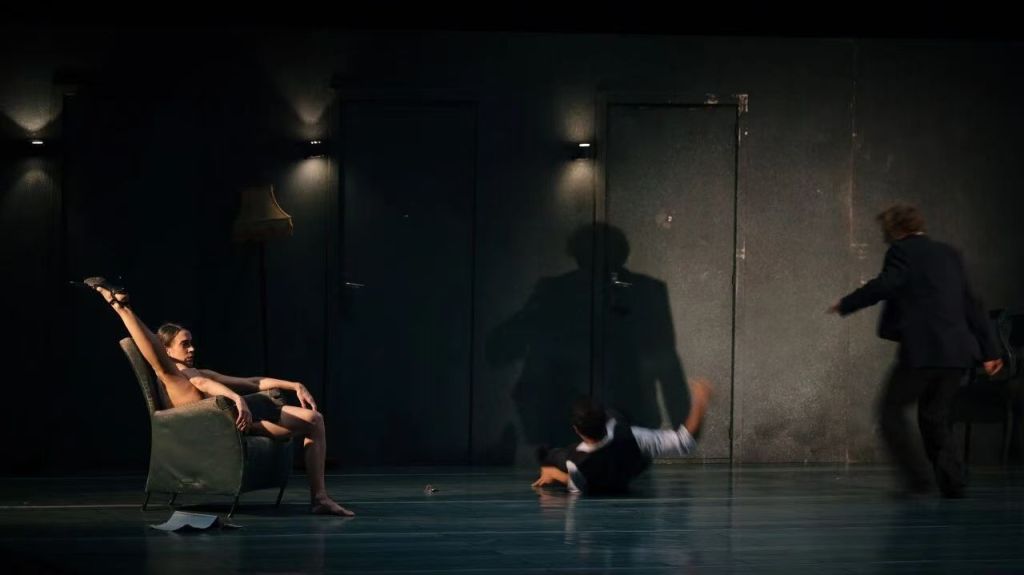 而当重新“倒带”至时间凝固的那一刻,原本的角色安排在舞台上被打散,重新组合成新的意义关系。令人印象深刻的还有那些充满故障美学的视觉化表达:舞者们与一把顽固的钥匙缠斗,其动作精准呼应着随之而来的振动节奏与强度。当失控不断加剧,整条长廊仿佛在“异常”与“崩溃”的边缘战栗。在某一时刻,这种颤动甚至异化为人物切分音般的咒骂。