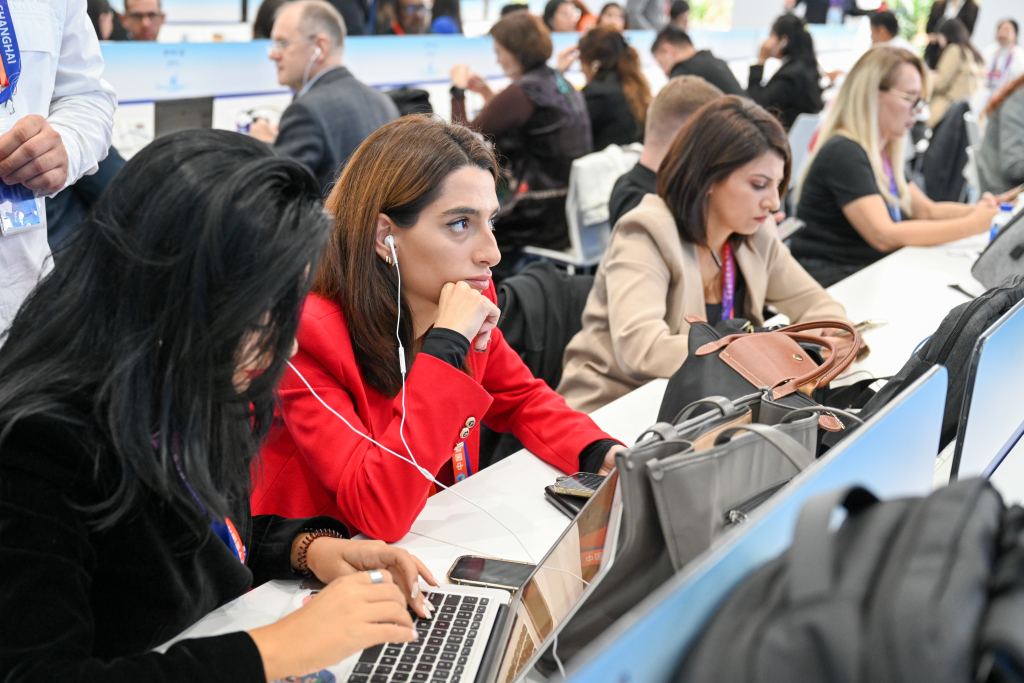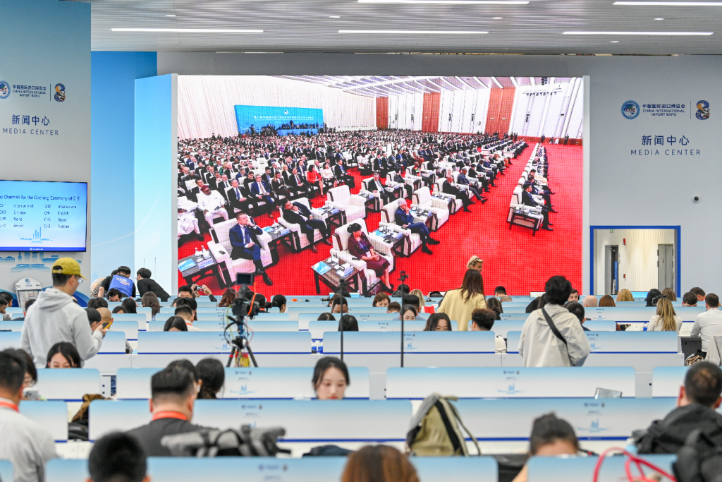 当天上午,国家会展中心(上海),中外记者在新闻中心聚焦进博会开幕式。今年进博会的记者整体报名规模和外媒报名规模均超过上届。