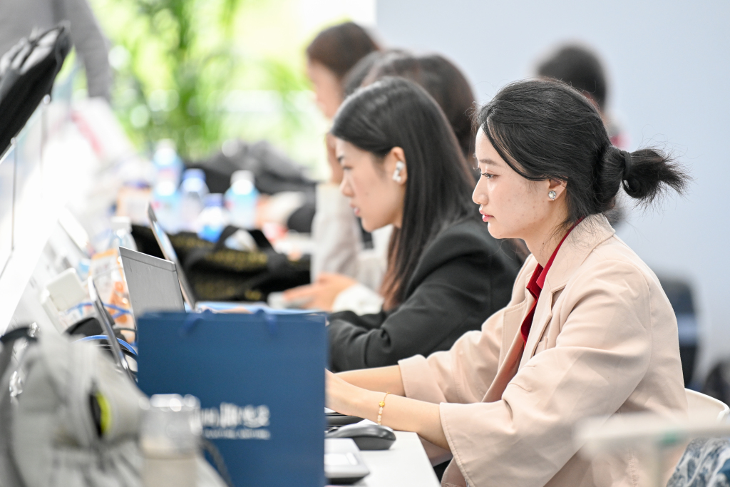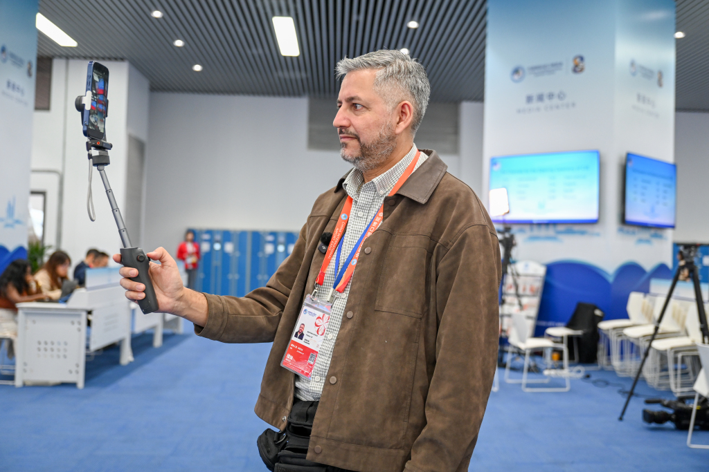 外国媒体记者在新闻中心拍摄视频。澎湃新闻记者 朱伟辉 图