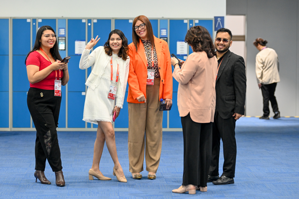 开幕式前外国媒体记者在新闻中心拍照打卡。澎湃新闻记者 朱伟辉 图