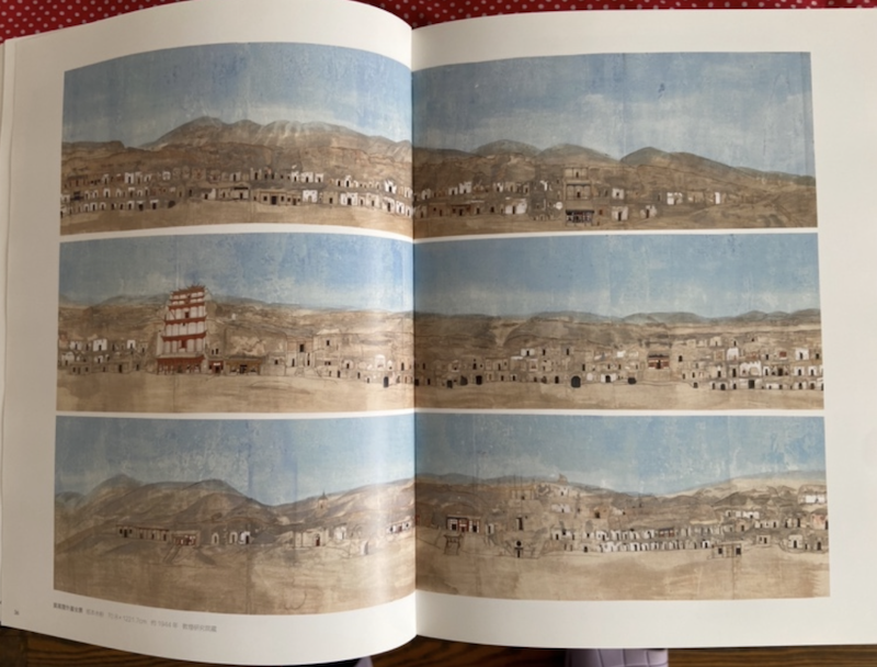2014年董希文百年诞辰时,展出了他为莫高窟外景留下的写生画卷《莫高窟外崖全景图》。该作品画于1943-1945年,画幅长达12米(70.8 X 1221.7cm),描绘了沙漠之中长达1公里的千佛洞的石窟景象,蔚为壮观, 绵延不断的土黄色山丘上,展露着几百座石窟,有的十分简陋,只有寥寥几笔,有的颇有装璜,莫高窟的多层楼阁十分醒目。我站在那里,深深地被画面震撼,荒漠与无数的石窟融为一体,感受到的是时间与空间的威力,宗教信仰的力量,不难想见当年董作画时的心情。90年代我去敦煌时已看不到这样的景观,如今的变化则更大了。