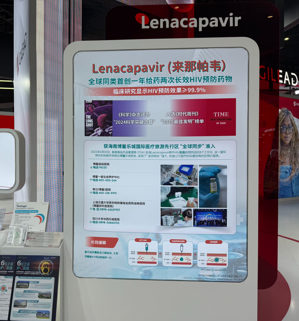 “中国HIV防控仍面临重点人群干预难题,长效制剂能显著提升依从性。”吉利德科学全球副总裁、中国区总经理金方千告诉澎湃新闻(www.thepaper.cn)记者,Lenacapavir通过皮下注射给药,对口服药物不耐受或依从性差的高风险人群尤为适用。“2025年6月底,借助海南博鳌乐城国际医疗旅游先行区政策,这款药物获批用于HIV暴露前预防,与美国食品药品监督管理局(FDA)获批仅隔数日,开创了国内先行区获批几乎同步于美国FDA获批的先例,10月22日,Lenacapavir在博鳌一龄生命养护中心完成中国首例应用,这也是其在美国本土以外的全球首例应用。该款药物的引入,有望重构中国HIV暴露前预防体系,为“终结艾滋病流行”目标提供关键工具。