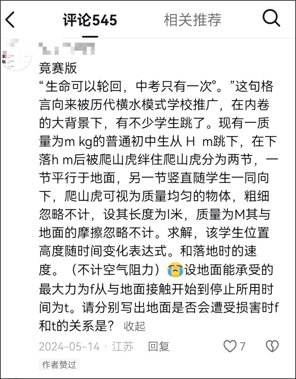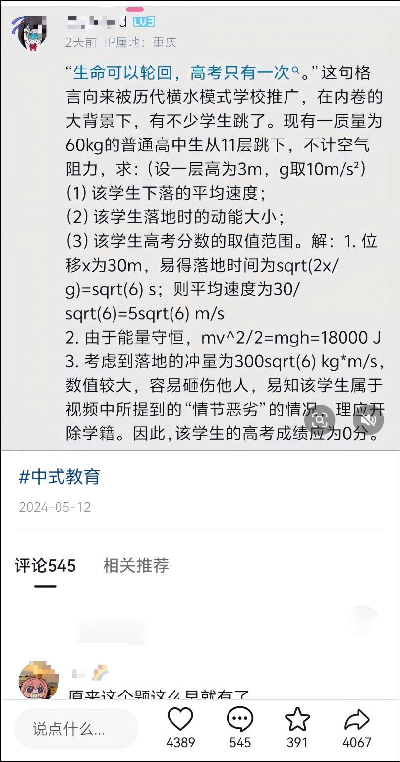 当然有的网友可能会说,为学生从枯燥的试题里走出来,走近生活,所以教学和题目都要接地气,那说说跳楼怎么了?