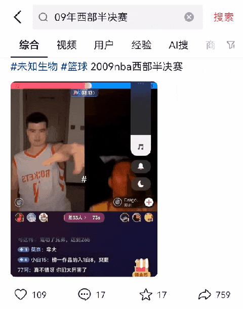 去年短视频平台搜索 "09 年西部半决赛 ",前面有一条视频,假姚明和假科比正在轮番肘击,看谁的支持率高。
