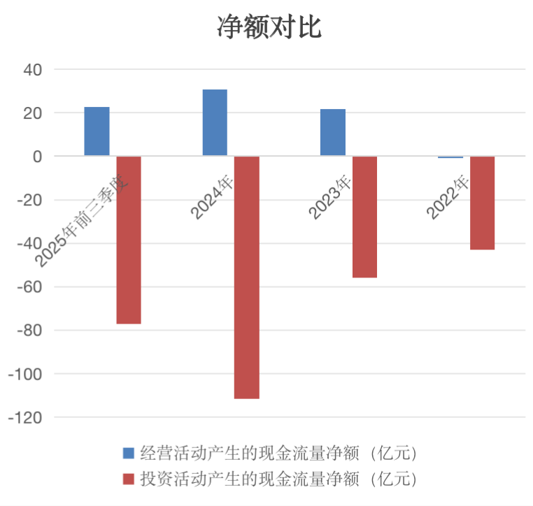 根据格林美的展望,2025年至2027年,公司规划销售收入目标分别为400+亿元、500+亿元与600+亿元。公司在建工程庞大(资产从2024年年初到的27.3亿元增长至2025年9月末的76.28亿元),经营活动产生的现金流量净流入覆盖不了投资活动产生的现金净流出。