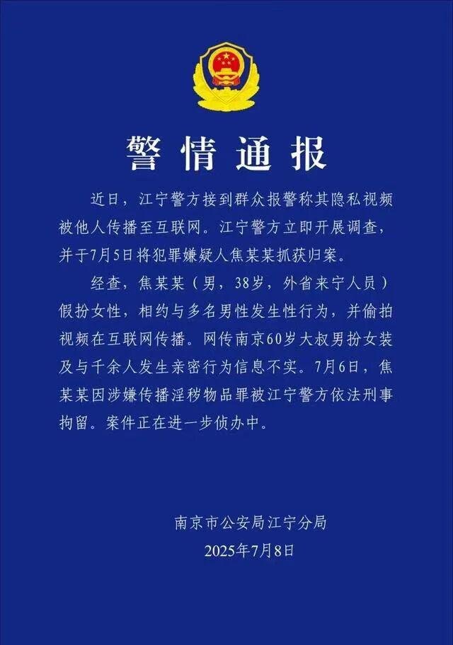 2025 年 7 月 8 日,南京江宁警方在通报中称,焦某某已被抓获,并因涉嫌传播淫秽物品罪被依法刑拘。" 红大爷 " 就像一面照妖镜,一面照出人性的荒诞与丑陋,一面照出其法律意识的淡薄和对个人隐私权的淡漠。