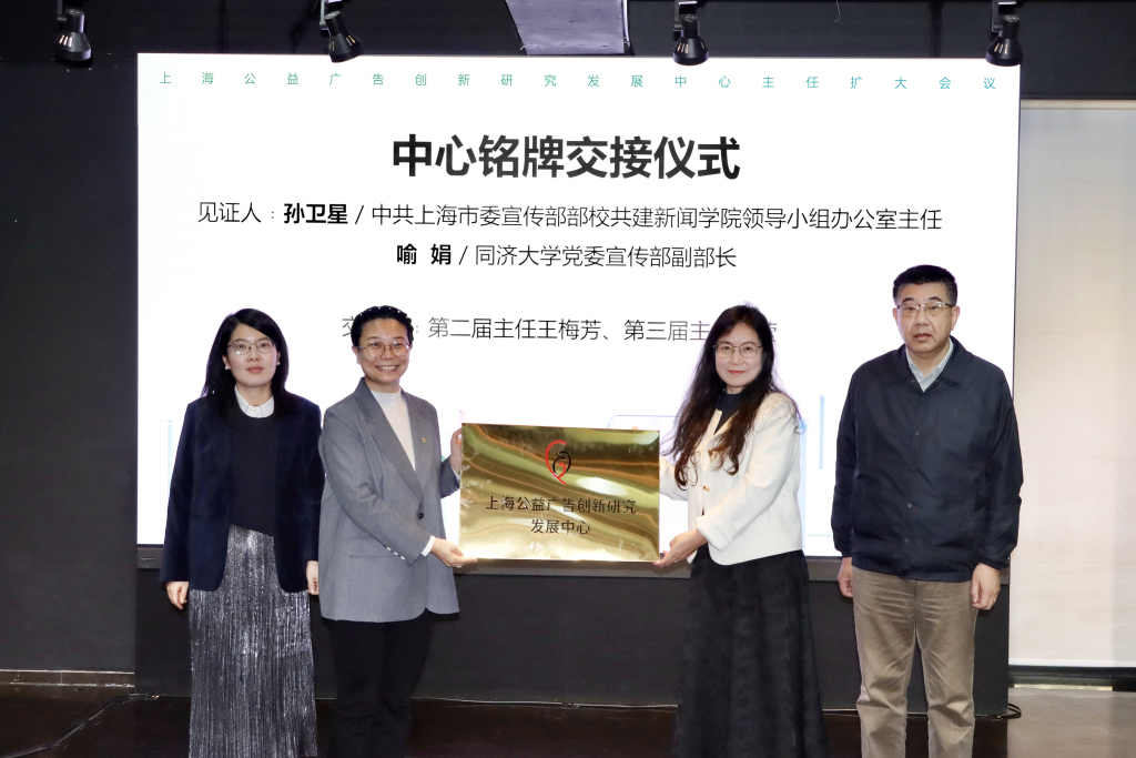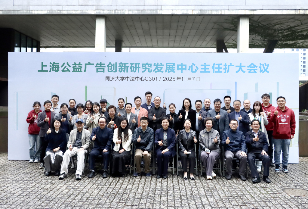 2025年11月7日下午,上海公益广告创新研究发展中心主任扩大会议在同济大学中法中心C301会议室顺利召开。同济大学党委副书记曹静,中共上海市委宣传部部校共建新闻学院领导小组办公室主任孙卫星,上海市市场监督管理局二级巡视员、广告处处长张红冰,上海建桥学院校长朱瑞庭(代表)等领导出席,来自复旦大学、华东师范大学、上海大学、上海师范大学、上海广告研究院、SMG东方广播中心、东方明珠移动电视、德高广告(上海)有限公司、上海申通德高地铁广告有限公司、上海看榜信息科技有限公司等单位的40余位代表参加了此次会议。同济大学艺术与传媒学院党委书记崔莹主持了此次会议。