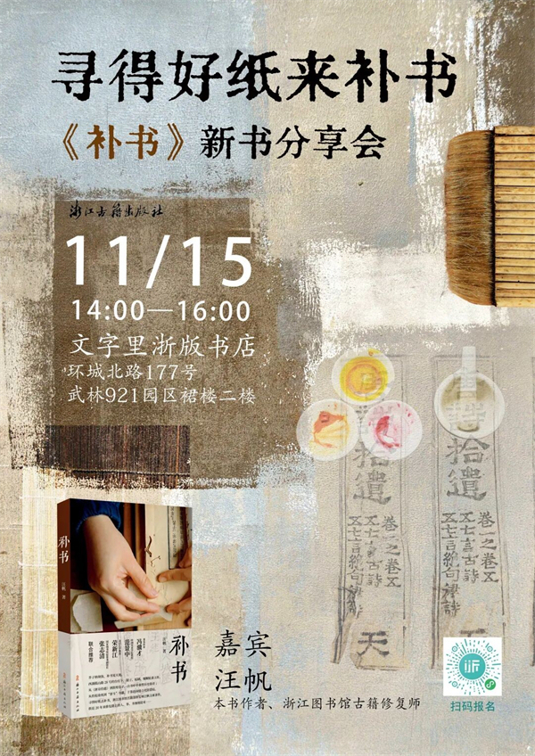 苦竹纸、扎花纸、桑皮纸、陈坊竹帛、瓷青纸……这些听起来充满古意的名字,并非诗词中的意象,而是让破损古籍重获新生的“密钥”。11月15日下午,浙江图书馆古籍修复师汪帆,将带着她的新作《补书》来到文字里·浙版书店。这一次,她不仅分享修复古籍背后的惊心与执着,更将我们带入一个硬核的“中国古法手工纸”世界。